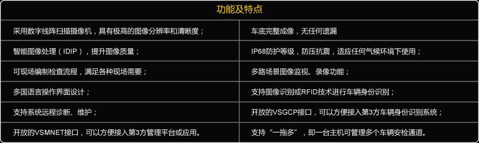 VS-UVSS-1S/F系列地埋式車底安檢系統(tǒng)是一套集對車輛底盤進(jìn)行圖像采集、顯示、對比、警示為一體的信息管理系統(tǒng),能有效防止車底藏匿炸彈、武器、 生化危險(xiǎn)品、危險(xiǎn)人物出入重要場所。該系統(tǒng)主要應(yīng)用于機(jī)場、監(jiān)獄、重要物資倉庫、油庫、銀行庫區(qū)以及海關(guān)、邊境等反恐重點(diǎn)場所的出入口檢查。